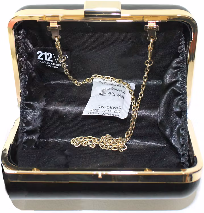 Carolina Herrera 212 VIP Clutch Bag har tillverkats av ett slätt svart tyg och präglats med 212 loggan.Detaljer i guld och med en guld metallram och ett litet i
