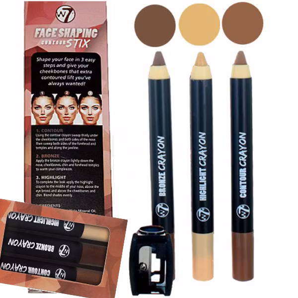 W7 Face Shaping 3 Contour Stix Highlight, Bronzer&Contour Shade är den trio-contourande produkten.Kitet ingår:Contents: 1x Highlighter, 1x Bronzer, 1x Conto