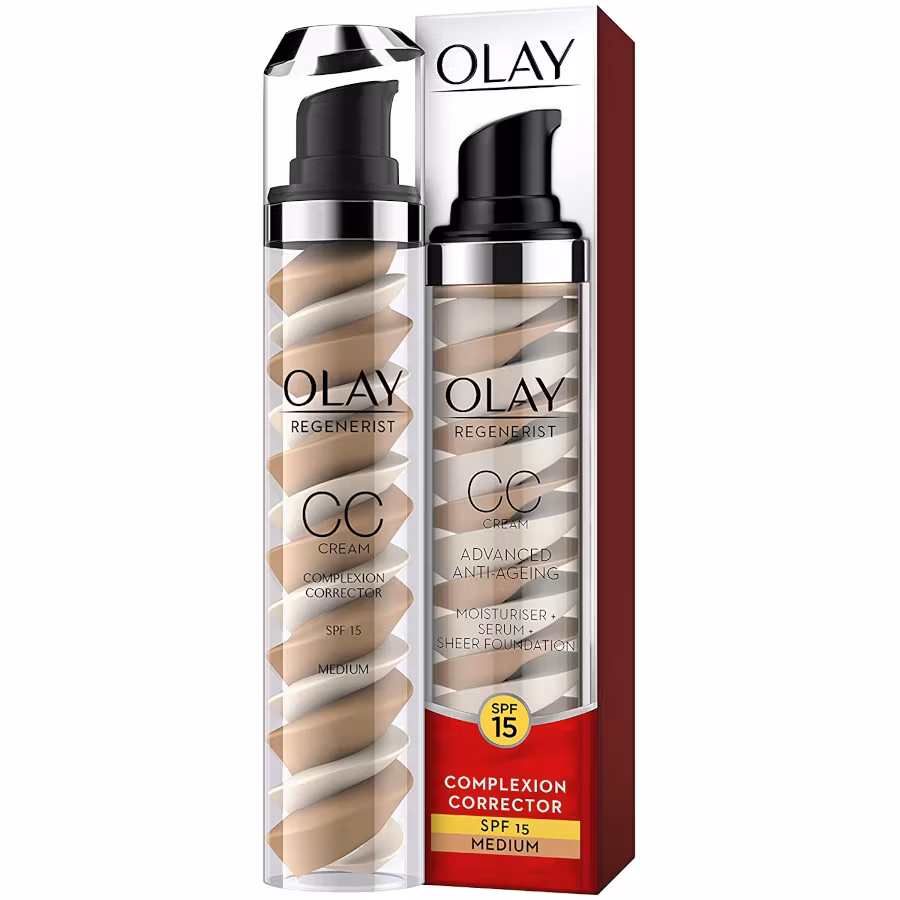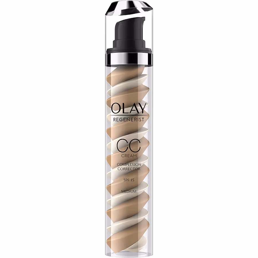 Olay Regenerist Anti-Ageing Complection Corrector CC Day Cream SPF15 är en fuktkräm med en trefas avancerad teknologi. Det skyddar från de skadliga UVA/UVB-strålarna med brett SPF-skydd (vit fas), det ger fördelarna med ett anti-ageing serum med en vardaglig lätt finish (klar fas) och jämnar omedelbart ut hudtonen med ren foundation (tonad fas) . Olay Regenerist CC Cream med SFP15 återfuktar huden och jämnar ut dess ton för en perfekt hy. Den innehåller synligt tonkorrigerande vitaminer och den minimerar omedelbart utseendet på mörka fläckar samtidigt som den jämnar ut hudtonen direkt och över tiden. Minskar utseendet på fina linjer och rynkor.