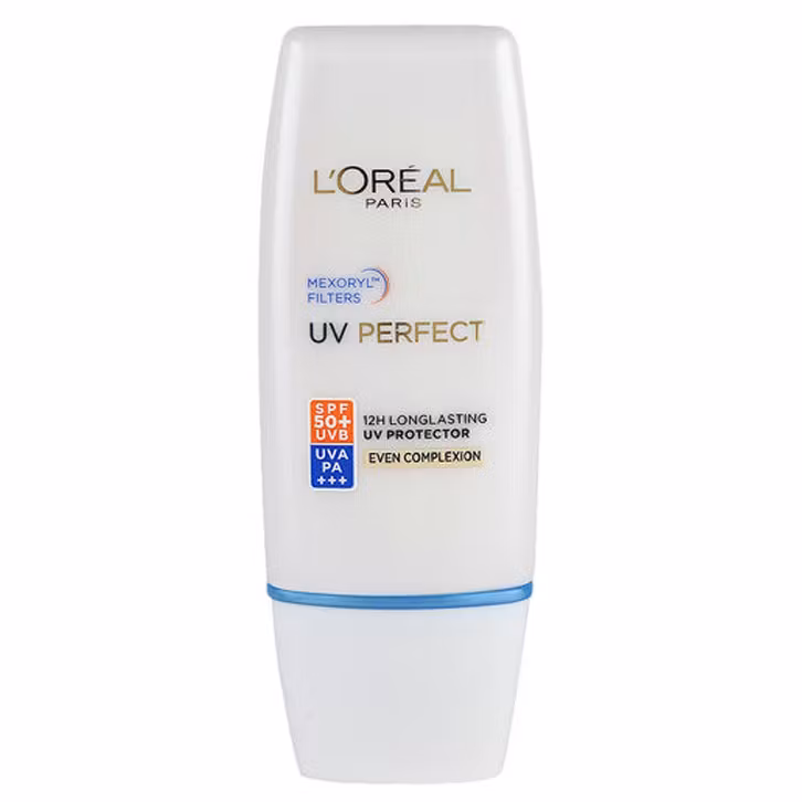 L'Oreal UV Perfect 12H Longlasting UV Protector innehåller patenterade Mexoryl SX & Xl som erbjuder UVB & UVA-skydd och förhindrar uppkomsten av bruna fläckar, mörkare hud, förtidiga åldrande av hud.matthet, förlust av elasticitet, lossning av hudens textur och ökning av rynkor.