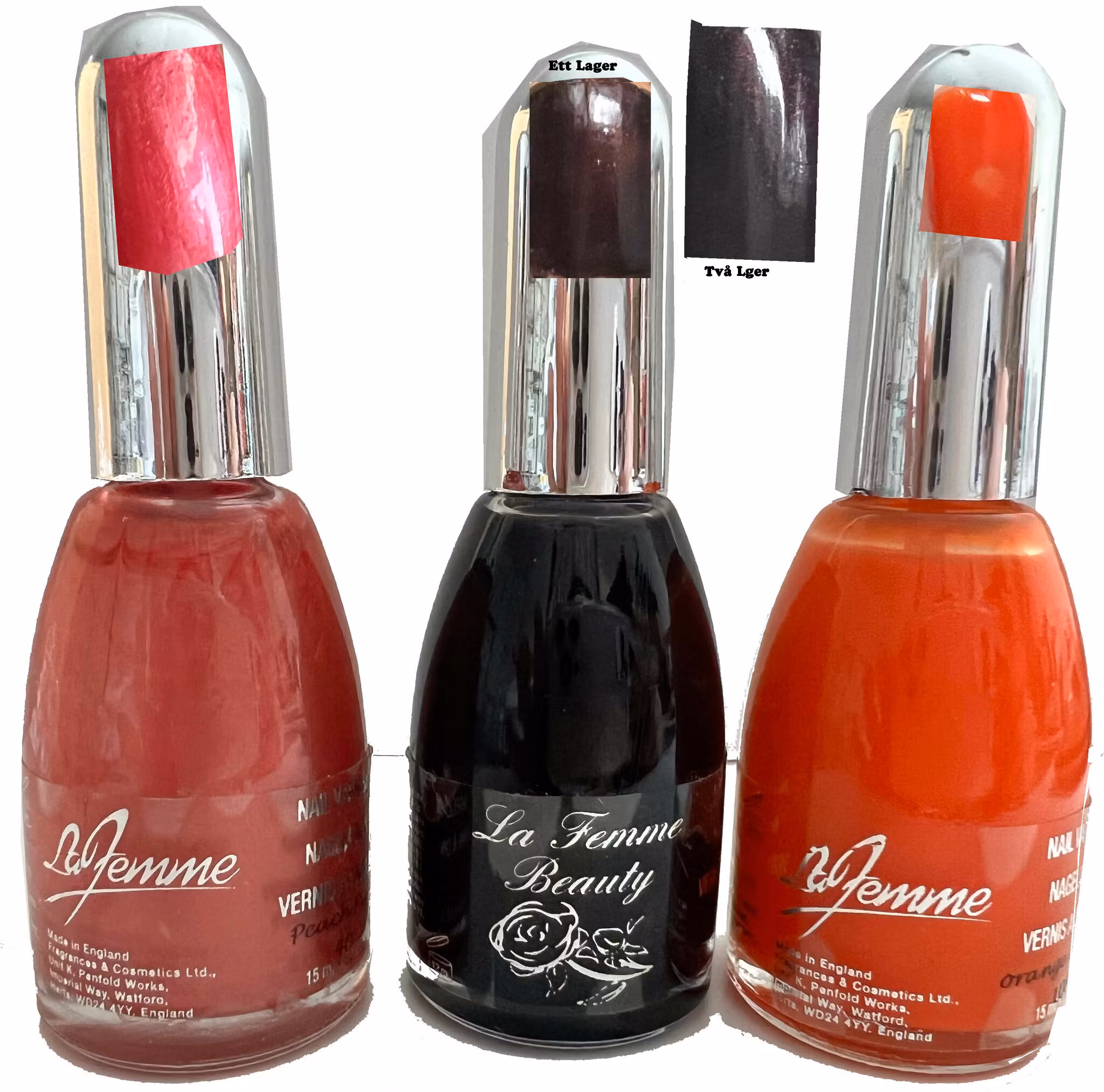 La Femme Silky och glitter Nagellack i snygg nyans & högkvalitet.Ger näring och samt en långvarig nyans till naglar.Innehåller 15ml x 3Färgkod: Peach Buff,