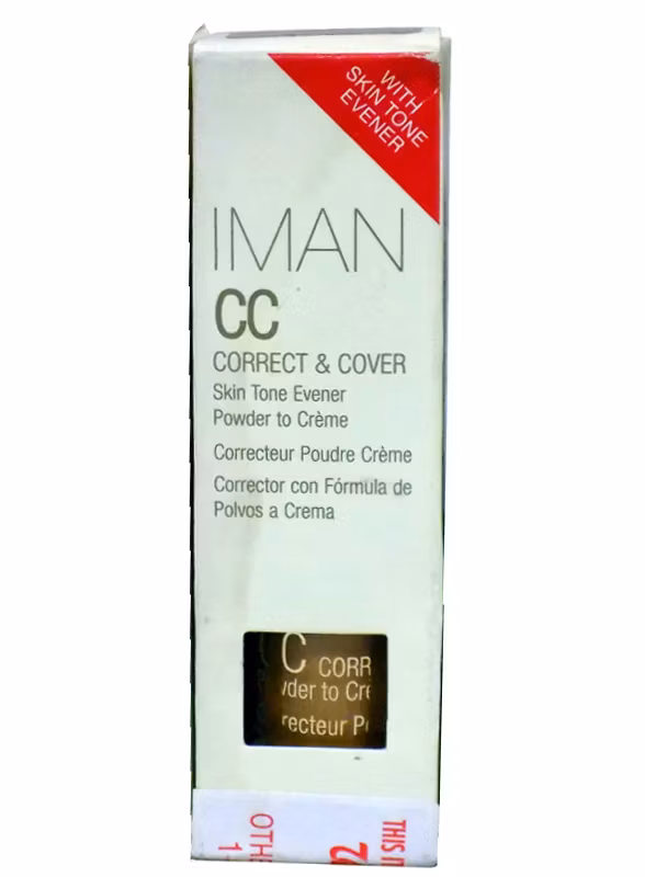 IMAN CC Correct & Cover Skin Tone Evener Powder to Creme Concealer:-Berikad med mineraler, växtextrakt protein, vitaminer B, C och E och betakarotein för at