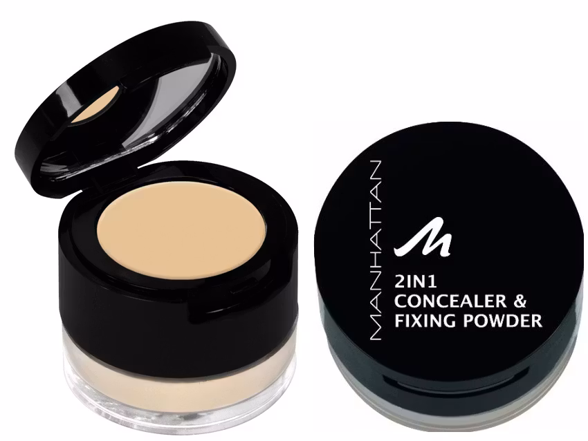 Manhattan 2 in 1 Concealer & Fixing Powder, dvs 2 steg i 1, 2 färger, perfekt för resanKrämigt, mycket täckande concealer Fix &Transparent puder för ett