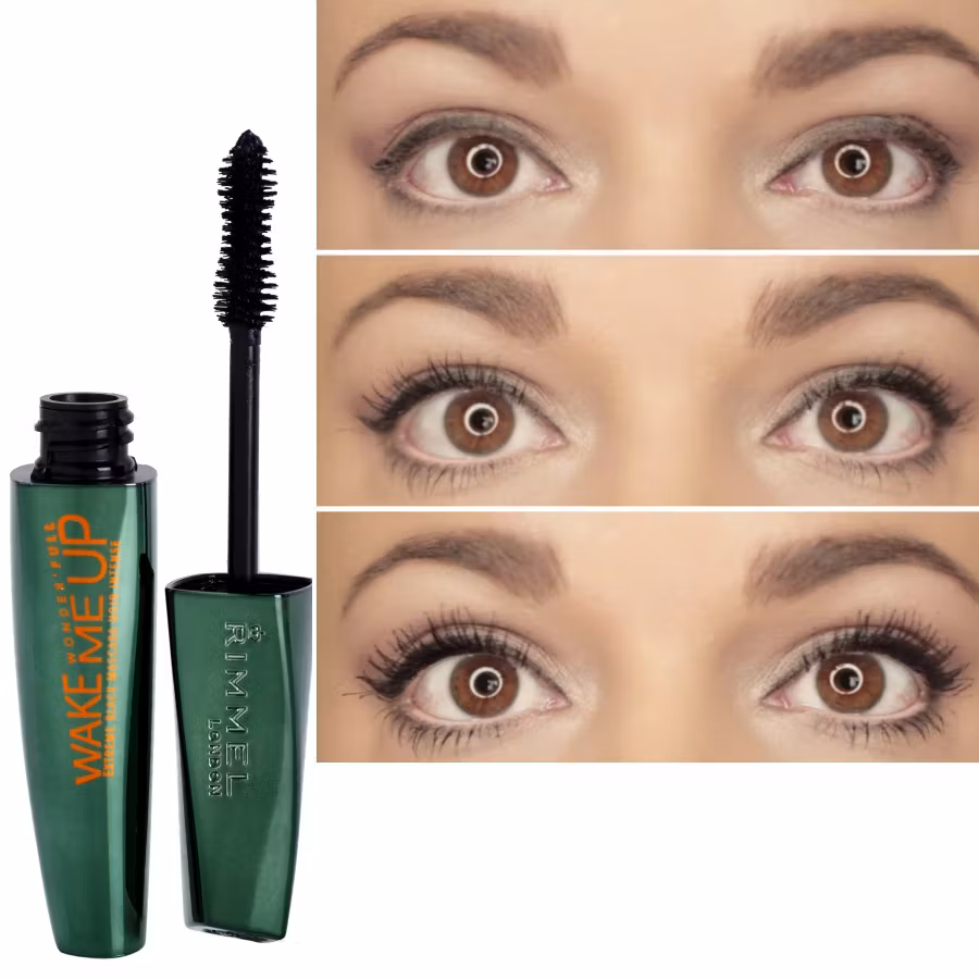 Rimmel Wonder'Full Wake Me Up Mascara har en dubblformad fiberborste som kan även nå de små svåråtkomliga fransarna och ge en dramatisk volym och lyft. Formulan