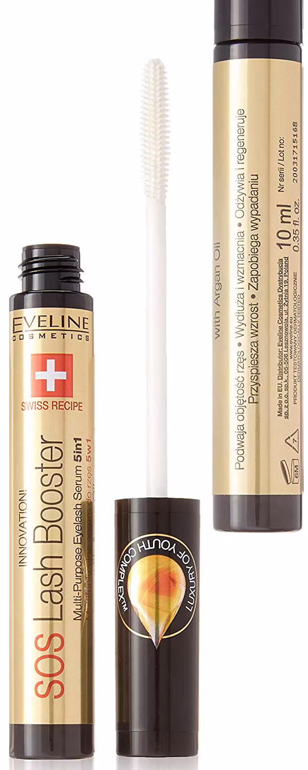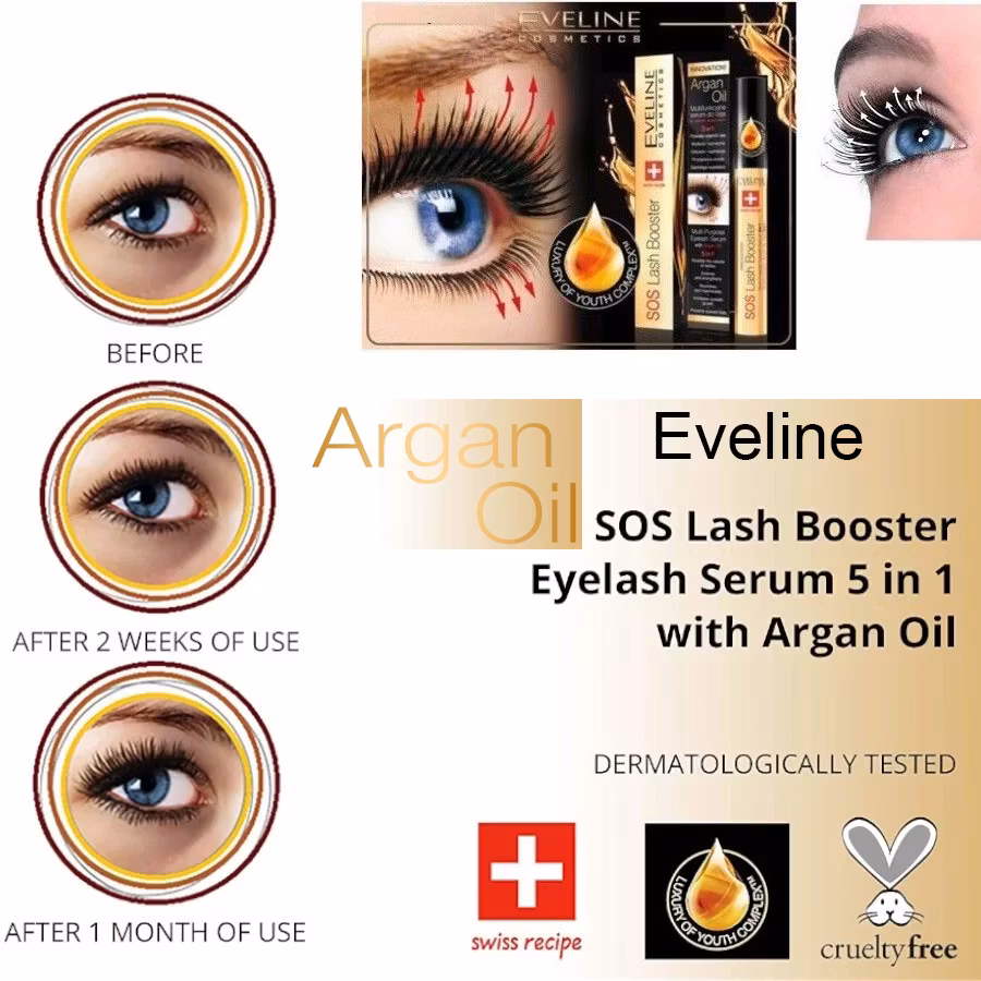 Eveline SOS Lash Booster 5 in 1 Eyelash Serum with Argan Oil har fördelar:1. Fördubblar ögonfransarna2. Förlänger och stärker3. Närar och regenererar4. Ökar ögo