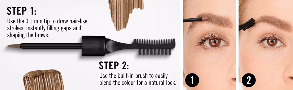 Superfina applikatorspets ger definition hårstrå för hårstrå, medan den inbyggda borsten säkerställer en blandad look.