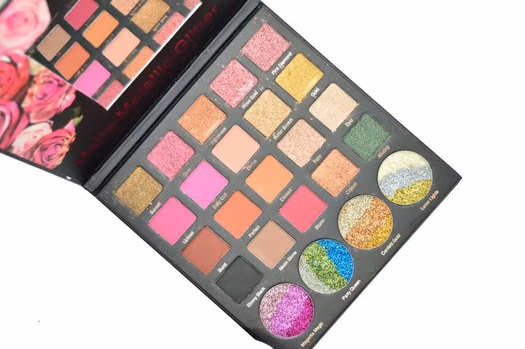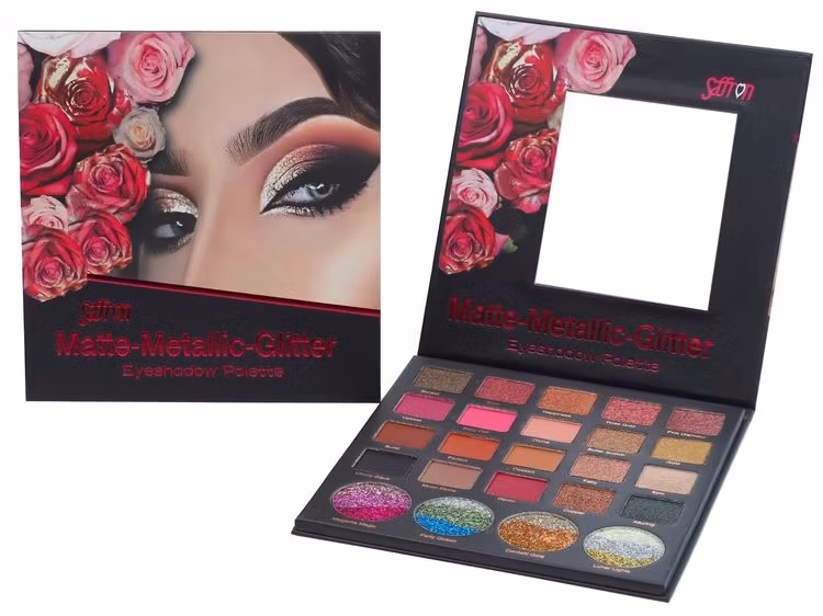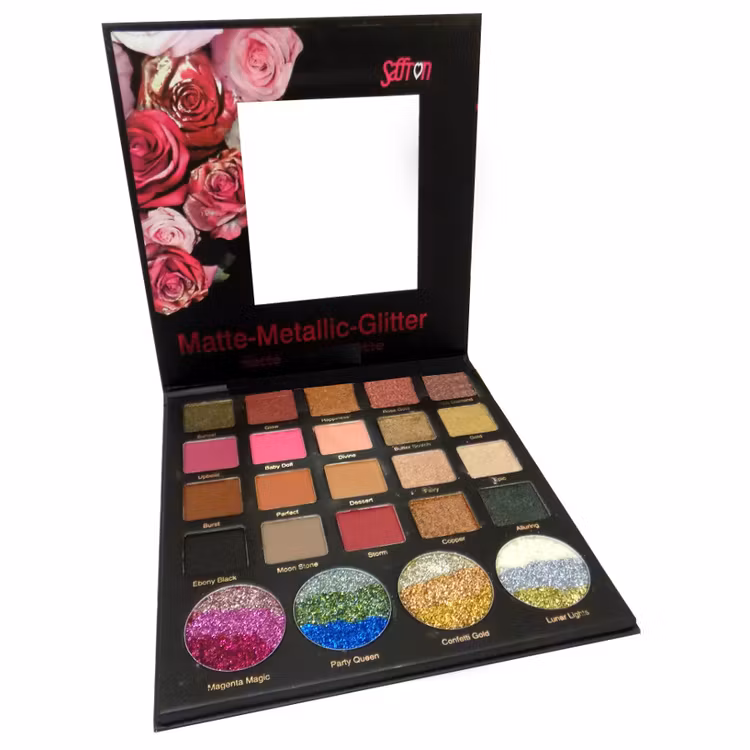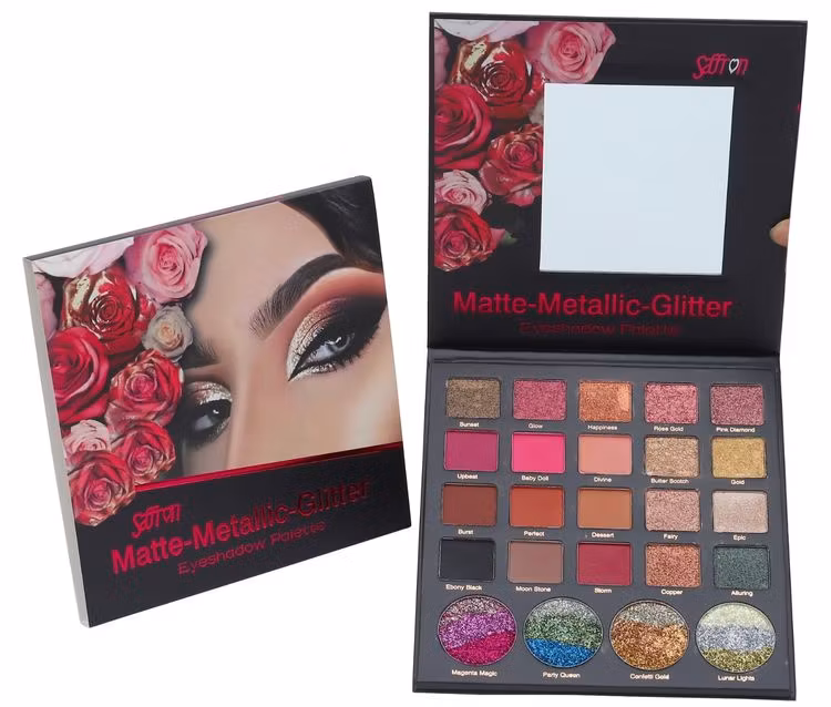 Innehåller 4x3st släta och krämiga glitter- nyanser i kompaktpuder-form, 9st matt-nyanser och 11st högpigmenterade& krämiga metalliska-nyanser.