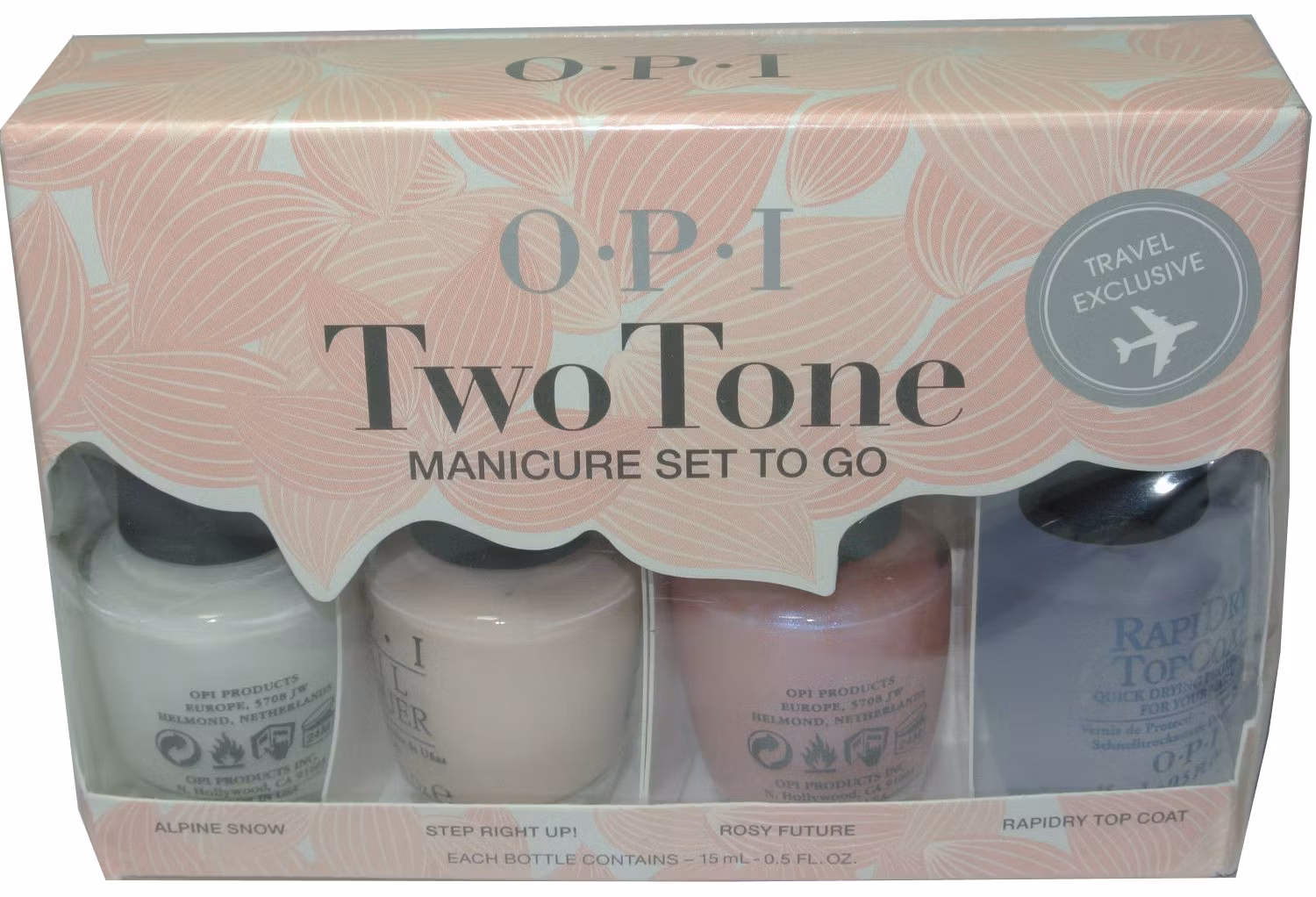 OPI Two Tone Manicure Set To Go - Helt NySetet består av:OPI Lacquer Alpine Snow 15mLOPI Lacquer Step Right Up! 15mLOPI Lacquer Rosy Future 15mLOPI RapiDry Top