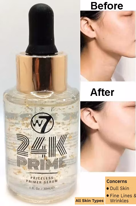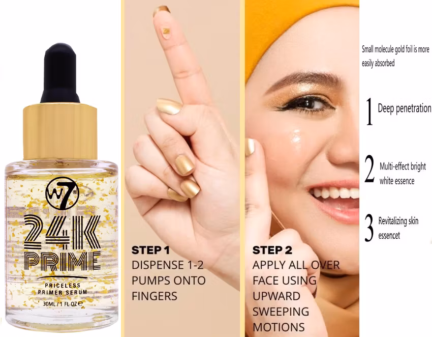W7s rikaste primer ännu! - 24K guldprimer serumPrimer består av en blandning av silkeslen slät, ultra-fuktgivande olja och fläckar av verkligt 24K guld!Applicer