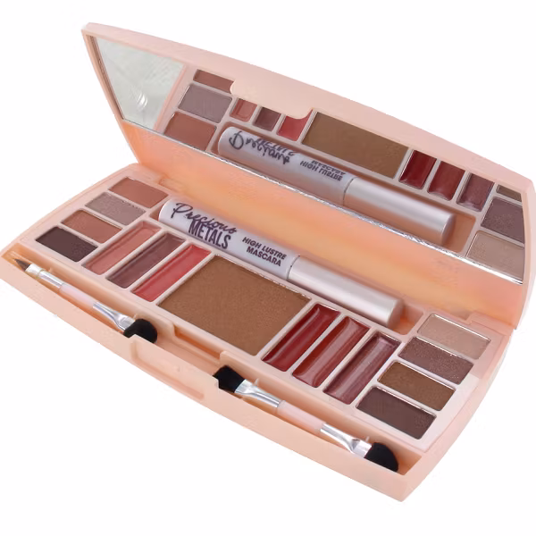 Innehåller: Ögonskugga (8x0.6g), Bronspulver (3.2g), High Luster Mascara (1,68ml), Lip Gloss (3x0,4ml), Läppstift