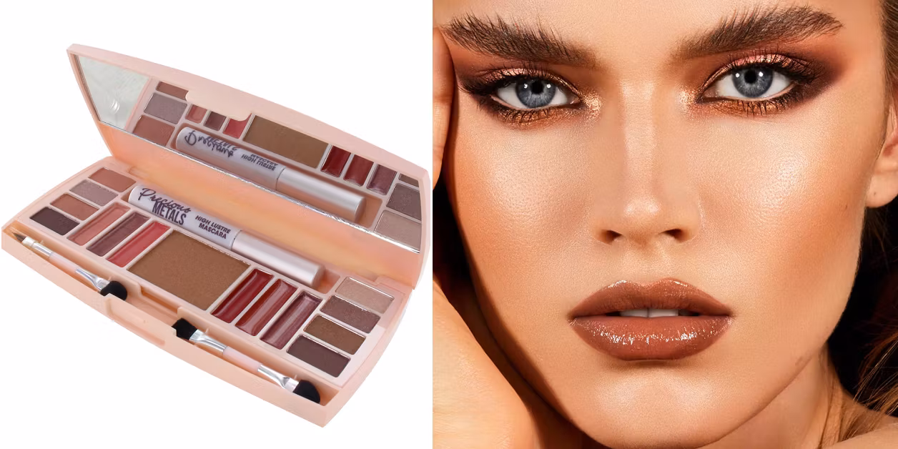 Paletten innehåller också sex högpigmenterade läppglansar i naturliga rosa nyanser genom till djup rubinröd och åtta metalliska ögonnyanser i nudes, beiges, bro