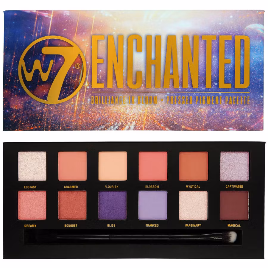 Enchanted är en ögonskuggpalett bestående av 12 matt-, skimmer- och duokrom-nyanser!W7 Enchanted-ögonskuggpaletten har en mängd färger som ger en blommig känsla